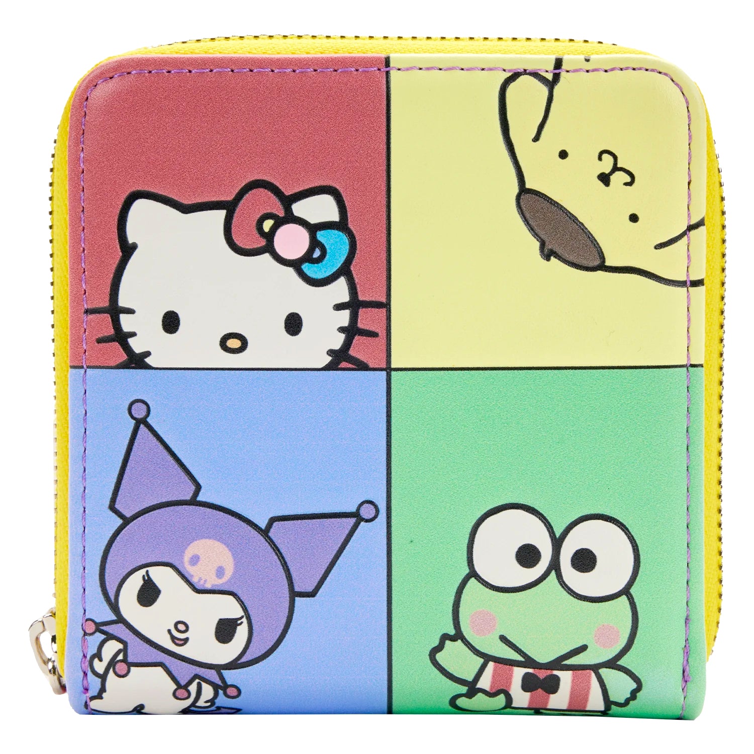 The squad's all here! The color clocked wallet with Hello Kitty, My Melody, Kuromi, Tuxedosam, Pompompurrin, and Keroppi, is the cutest accessory!